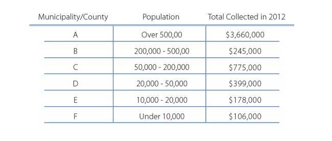 Collection results for individual municipalities and counties vary according to the number of cases and the outstanding balance of each case that is submitted to Aberdeen for recovery. With these variables in mind, the following are examples of collection results based on municipality/county population for 2012: